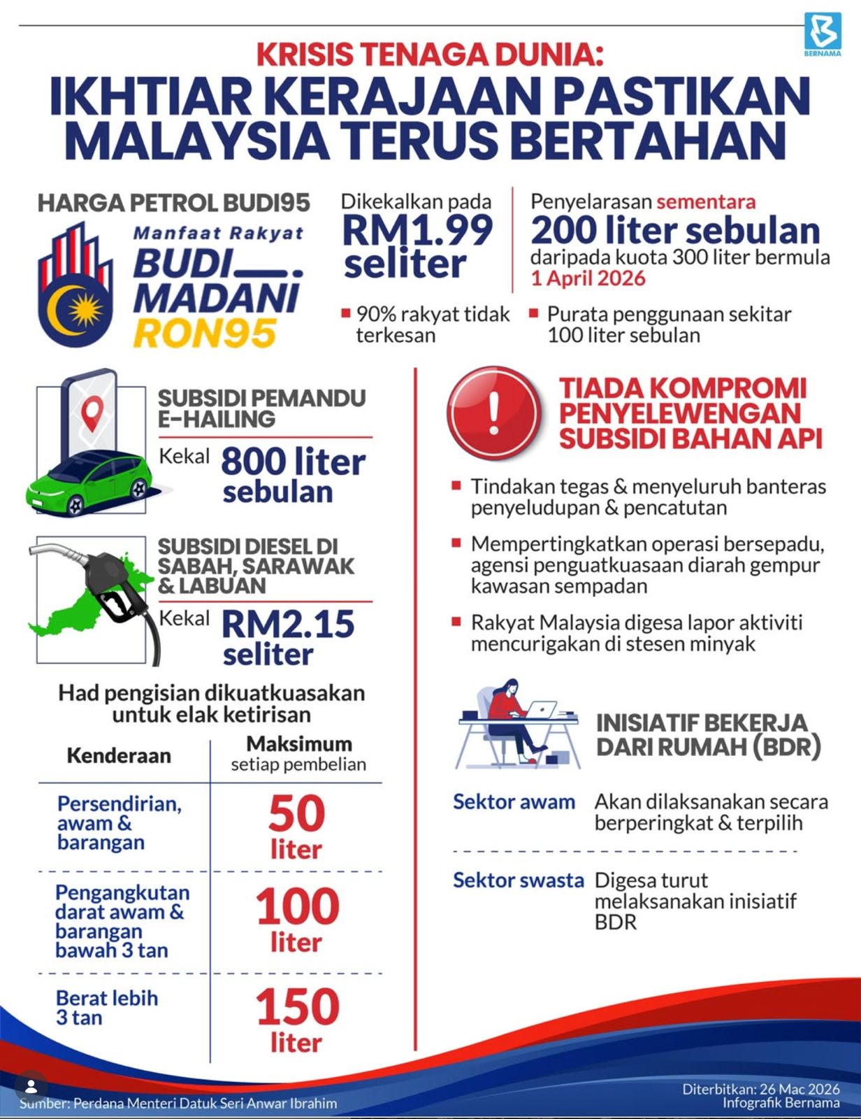 Semalam, PMX dah umumkan beberapa langkah kesiapsiagaan negara berdepan krisis tenaga global dengan kata mudahnya untuk pastikan kita mempunyai minyak untuk kegunaan domestik. Antaranya dari 300 liter subsidi bagi Budi95 kepada 200 liter dan Bekerja Dari Rumah (BDR) bagi penjawat awam secara berperingkat dan terpilih bagaimanapun sektor swasta digesa juga laksanakan BDR.